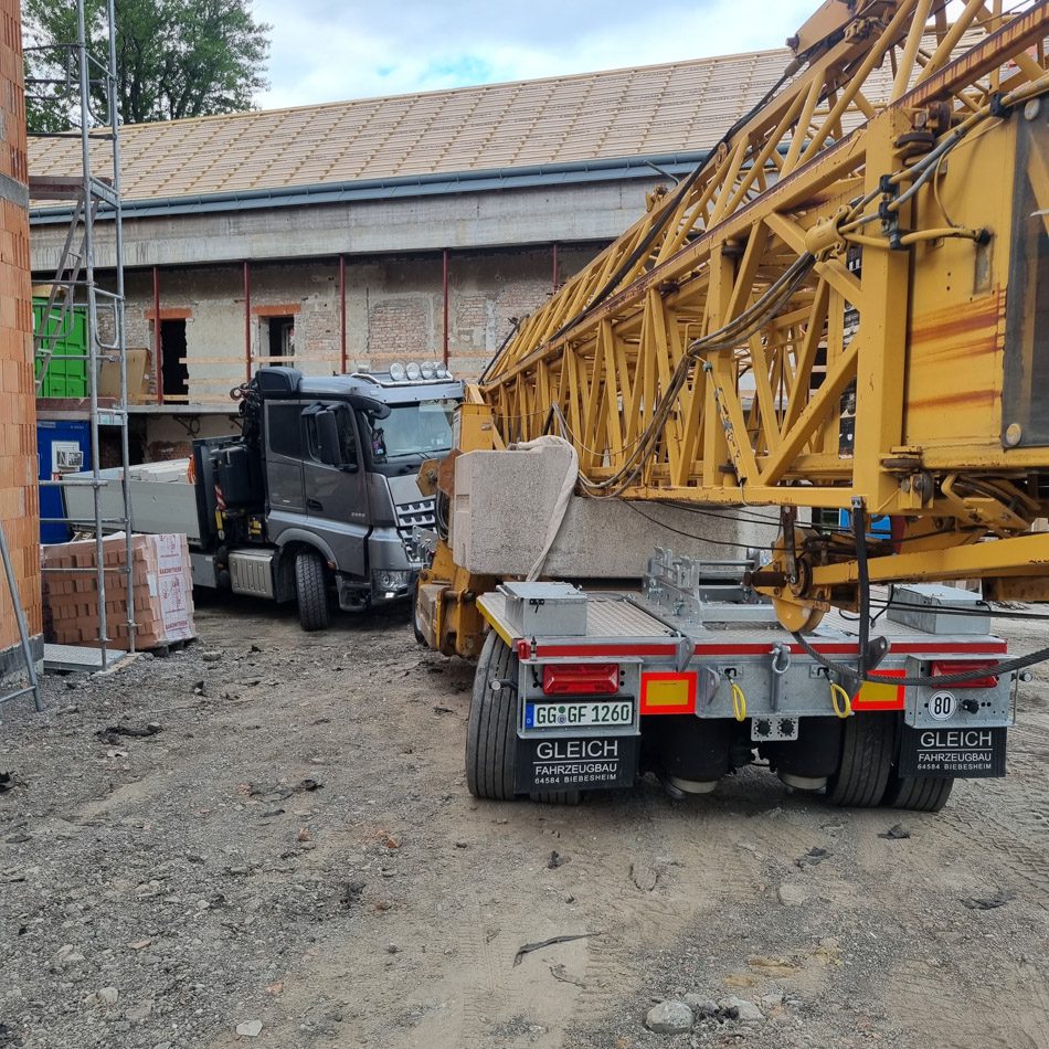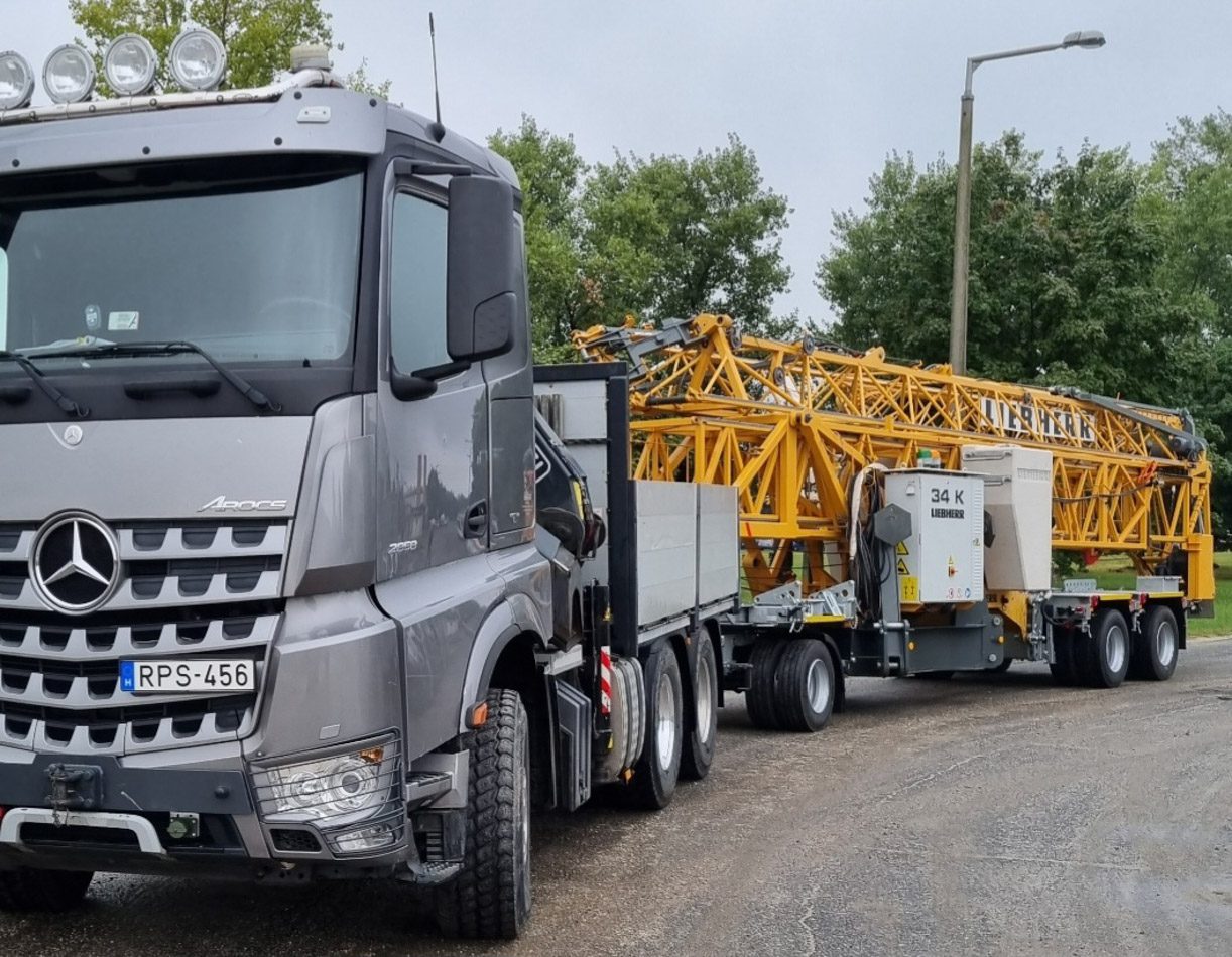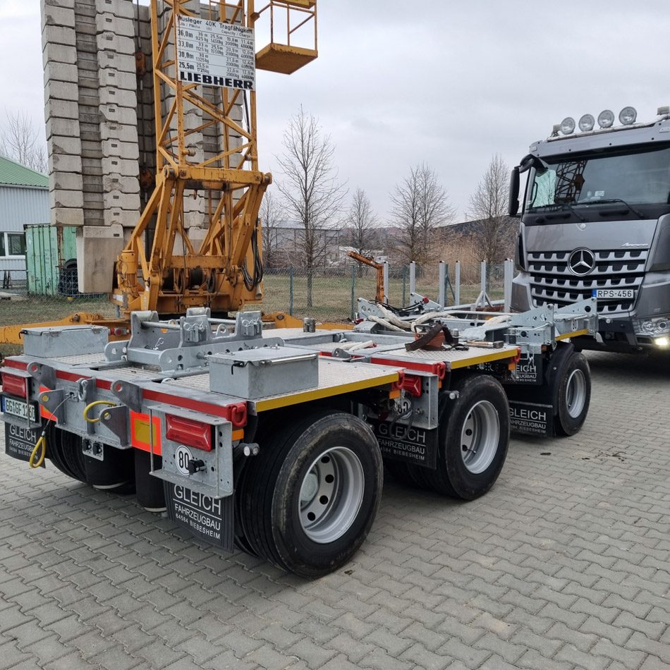 A toronydaruk szállítását modern német gyártmányú Gleich szállítótengellyel végezzük, amit kifejezetten a mi igényeink szerint gyártottak. A tengelykombináció variálható, a hátsó tengely is kormányozható, össztömege 32 tonna.